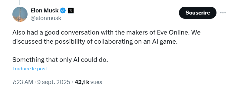 Sur son réseau social X, Elon Musk indique avoir discuté avec CCP Games (EVE Online) sur « la possibilité de collaborer sur un jeu IA ». En quelques heures, le cours de bourse de la maison-mère de CCP, Pearl Abyss, a grimpé de 10%.