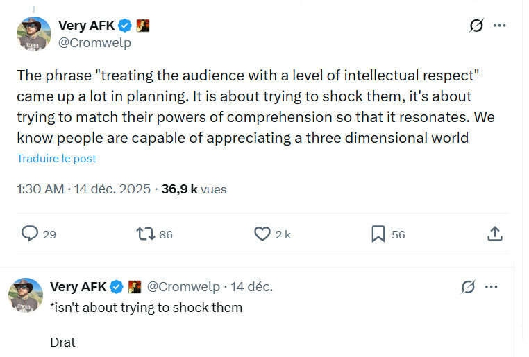 Sur les réseaux sociaux, Michael Douse, directeur de la publication chez Larian, apporte un début de réponse. Il indique que « traiter le public avec un certain respect intellectuel » a été l’un des leitmotivs de l’équipe de développement de la préparation de l’annonce. Et de préciser : « il ne s’agit pas de tenter de choquer [ce public], mais de s’adapter à sa capacité de compréhension pour que le message trouve un écho ; nous savons que les gens sont capables d’appréhender un monde complexe ». En d’autres termes, la bande-annonce dénote avec ce qu’on peut voir habituellement dans l’industrie du divertissement, elle peut se révéler dérangeante ou susciter un inconfort chez certains spectateur et c’est manifestement voulu. Et à certains égards, c’est sans doute la marque de fabrique de Larian – en son temps, Baldur’s Gate 3 aussi a marqué les joueurs par certaines de ses audaces et la liberté d’action (parfois morale) laissée aux joueurs, et cette profondeur a sans doute contribué à succès populaire et critique du jeu.